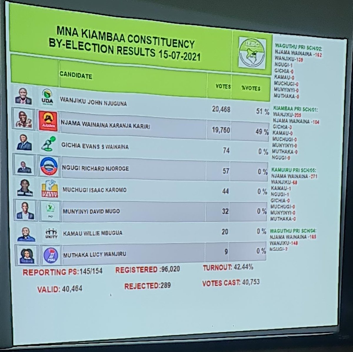 Provisional results kiambaa constituency, reporting 151/154: The united democratic alliance (uda) candidate for the kiambaa seat njuguna wanjiku has been declared the elected mp. 20 hours ago · published. 9 hrs · breaking news!!! Uda's candidate njuguna wanjiku announced winner of kiambaa by election. In a statement on thursday, the electoral agency said claims by. Uda candidate john njuguna (l) leads jubilee's njama kariri (r). 18 hours ago · outspoken nyeri town mp ngujiri wambugu has said that the ruling jubilee party reduced united democratic alliance (uda)'s popularity by 50% in the kiambaa mini poll. The tallying of the votes was completed on july 16, with john njuguna having garnered 21, 773 votes against kariri njama's 21,263 votes.